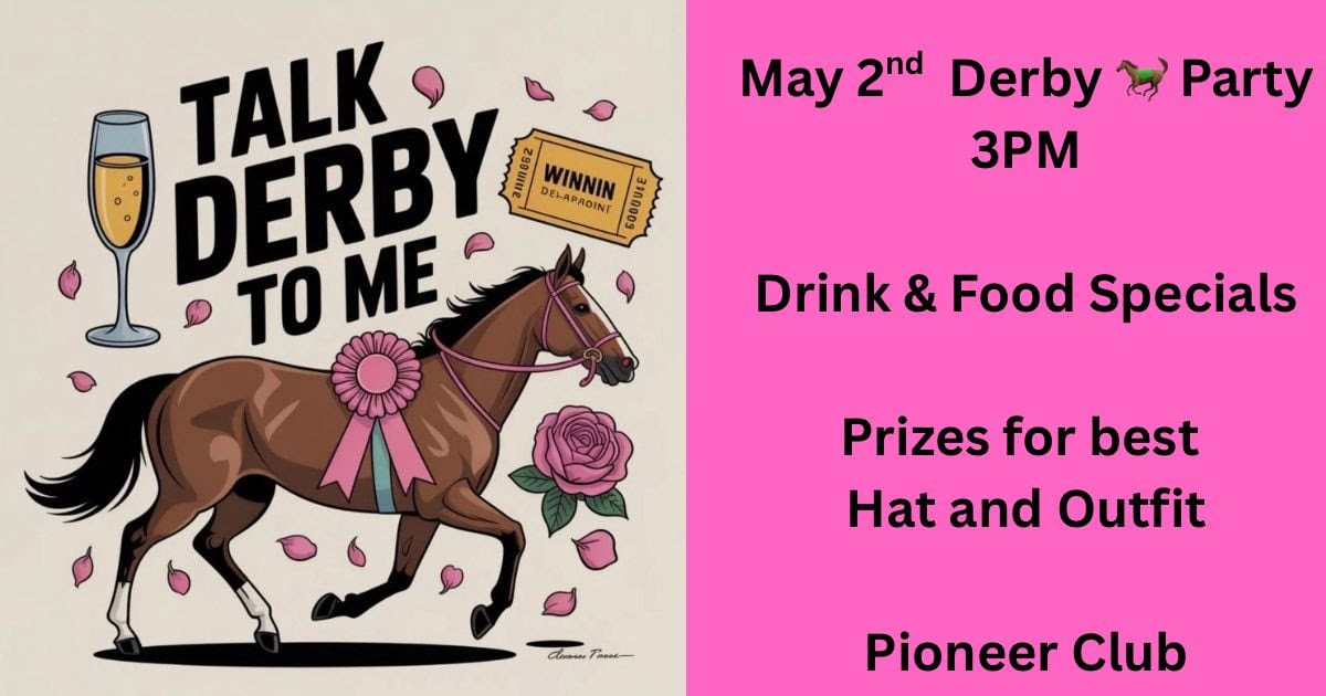 Saturday, May 2nd Kentucky Derby Horse Races Fun! The fun starts at 2pm Wear your Kentucky Derby hat or outfit for HaPpY Hour prices from 2-5pm Horse Races start at 2pm followed by The Kentucky Derby Race Stick around for DJ "Rob" playing all our favorites at 7pm!!