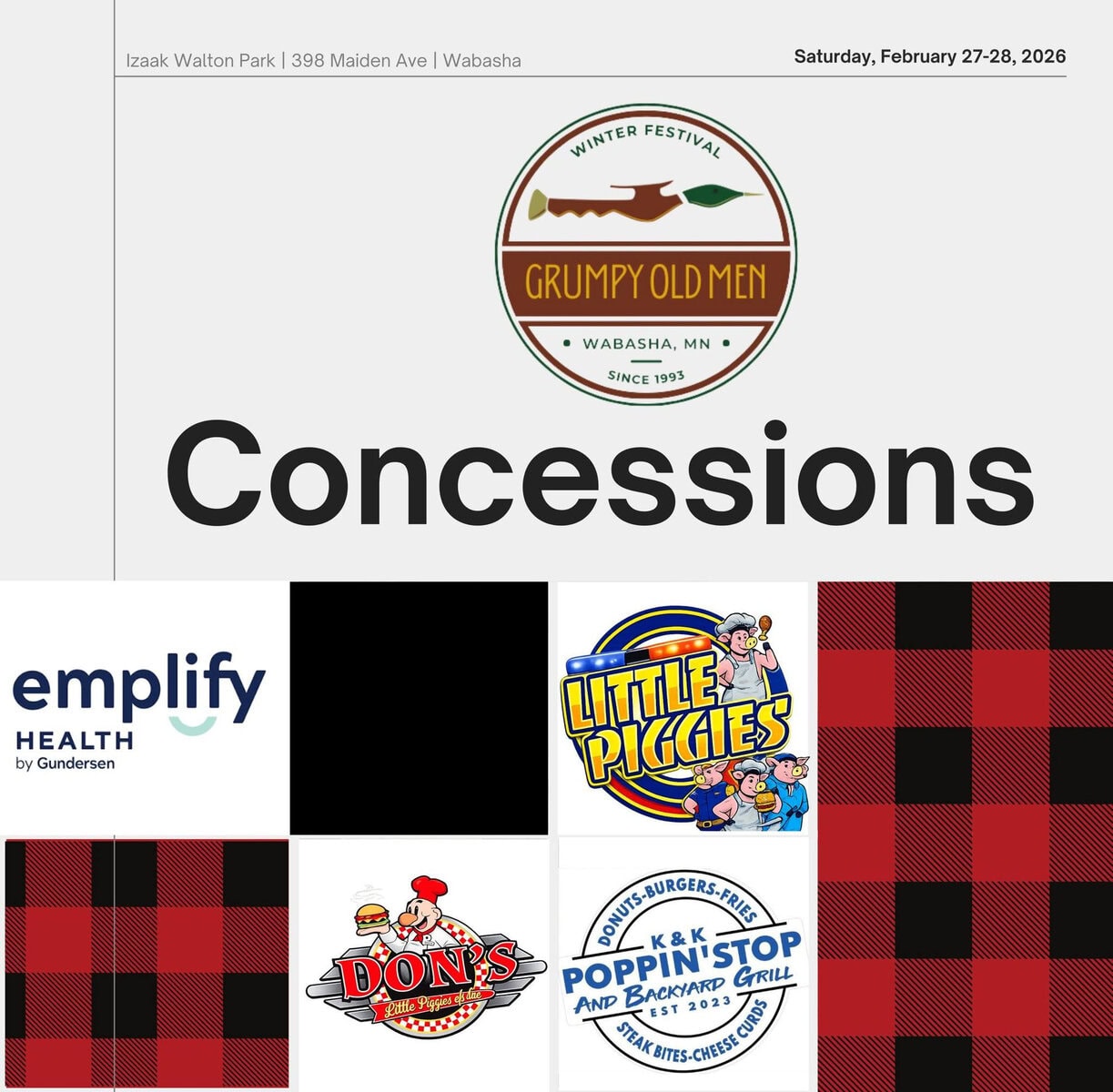 🍔🔥 Official Grumpy Old Men Festival – Concession Alley presented by Emplify Health! 🔥🍩Hungry during your day of winter fun? Follow your nose to Concession Alley, the official food lineup of the 33rd Annual Grumpy Old Men Festival!Our vendors are serving up crowd-pleasing favorites from Little Piggies BBQ, K&K Poppin’ Stop, and Don’s Food Truck—bringing the comfort food that keeps grumpy folks happy and bellies full.Dig into juicy burgers, smoky BBQ, crispy chicken sandwiches, crumble beef, golden cheese curds, mini donuts, and plenty more festival classics. Whether you’re warming up between events or refueling for round two, Concession Alley has something for every appetite.Come hungry, leave happy… or at least less grumpy. 😉February 27th - 5 pmFebruary 28th - 9 am