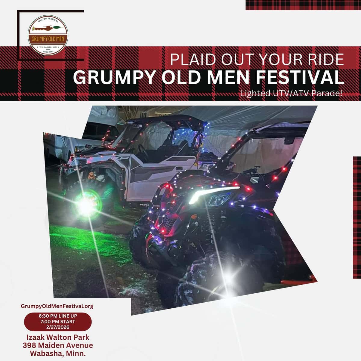4th Annual Grumpy Old Men Festival – Plaid Out Your Ride Lighted ParadeGet ready to light up Wabasha! The 4th Annual Plaid Out Your Ride Lighted Parade is rolling in on Friday, February 27, 2026, and we want YOU to be part of the glowing, plaid-filled fun.📍 Lineup: 6:30 PM at Izaak Walton Park📍 Address: 398 Maiden Avenue, Wabasha, MN🎉 Parade Begins: 7:00 PMDecorate your UTVs, ATVs, golf carts, trucks, trailers—anything that moves—and join us for a winter night full of lights, laughter, and Grumpy Festival charm. Buffalo plaid, twinkle lights, and creative themes are always encouraged!This year’s parade will be led by the Wabasha Police Department and will make its way through Main Street and surrounding neighborhoods, spreading that cozy hometown spirit along the way. A special moment of the route includes a drive-by at the Emplify Health Care Center, giving residents the chance to enjoy the lights and feel the warmth of the Grumpy Festival from their windows.Bundle up, grab your family and friends, and come cheer on this glowing cavalcade of winter fun. It’s one of the most heartwarming traditions of the Grumpy Old Men Festival — and it just keeps getting better every year.Join us and help light up Wabasha, one plaid-covered ride at a time!