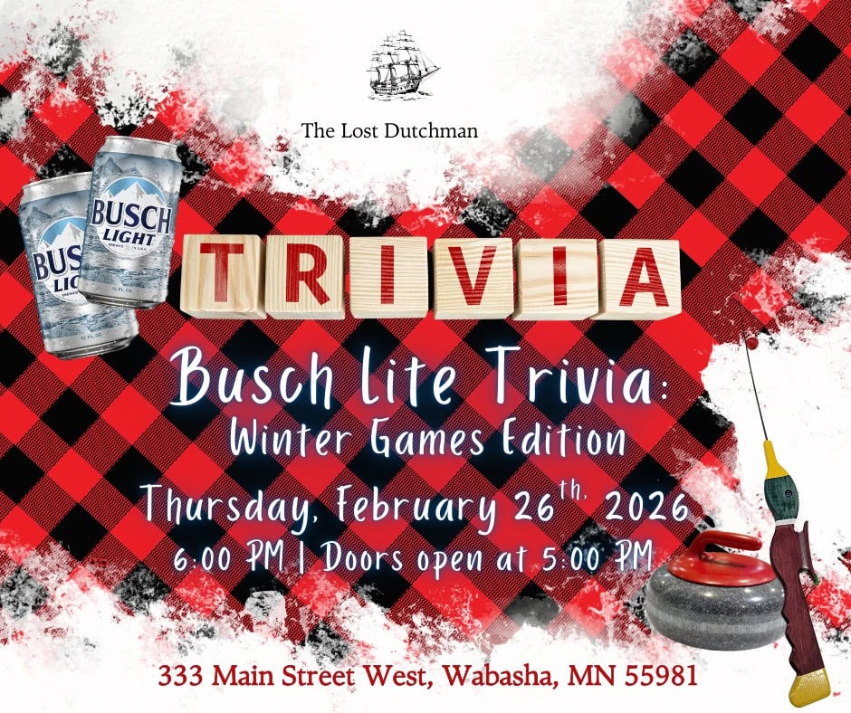 Bundle up and join us for Busch Lite Trivia: Winter Games Edition at The Lost Dutchman! ❄️🧠 Test your knowledge with a winter-themed trivia night inspired by cold-weather sports, icy history, and all things Busch Lite. Whether you’re a trivia pro or just in it for the laughs, this night is all about friendly competition, cold drinks, and good times. 🕔 Doors open at 5:00 PM 🕕 Trivia starts at 6:00 PM Grab your team, claim a table early, and get ready for a fun, laid-back night with prizes, bragging rights, and plenty of winter vibes. Don’t forget to wear your favorite flannel! 📍 The Lost Dutchman 333 Main Street West, Wabasha, MN