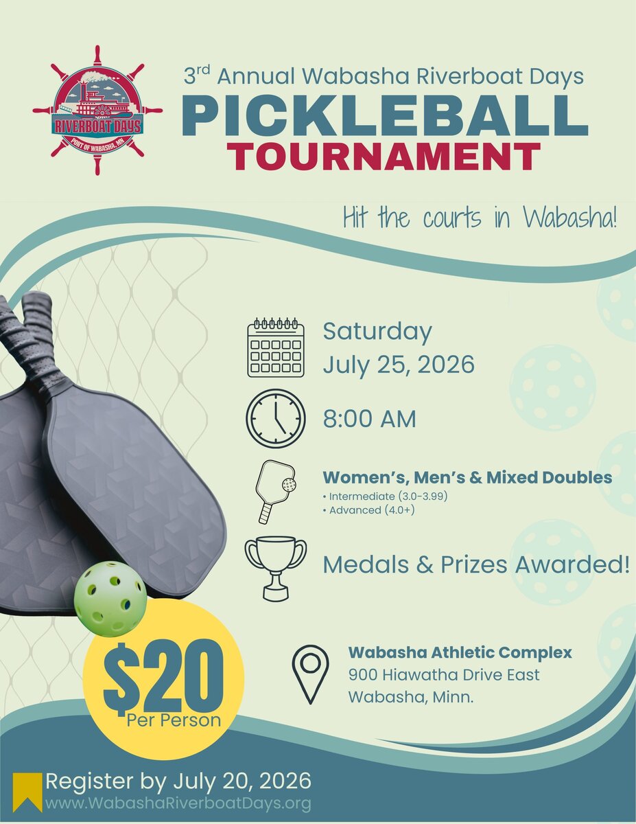 Jul 25 Pickleball Tournament 8:00 AM - 5:30 PM City of Wabasha Athletic Complex Hiawatha Drive East, Wabasha Event Details Get Directions
