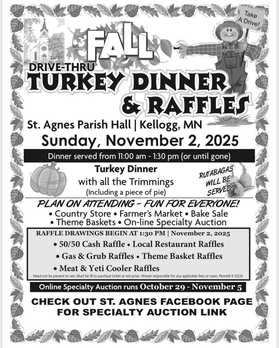 Fall Drive Thru Turkey Dinner & Raffles Nov 2 11:00 AM - 1:30 PM Fall Drive Thru Turkey Dinner & Raffles