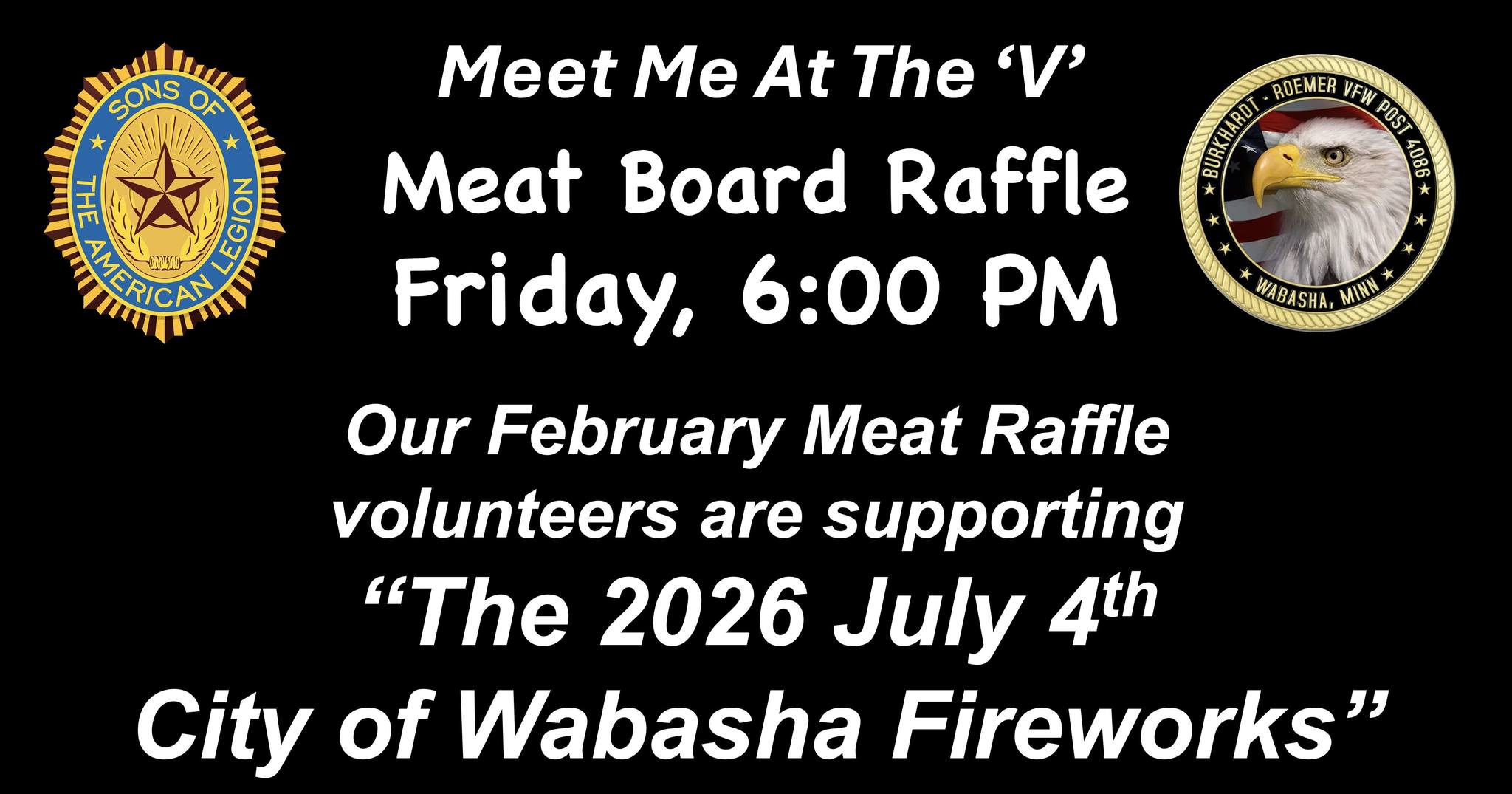 VFW Meat Raffle Supporting July 4th Fireworks Feb 6 VFW Meat Raffle Supporting July 4th Fireworks 6:00 PM - 8:00 PM