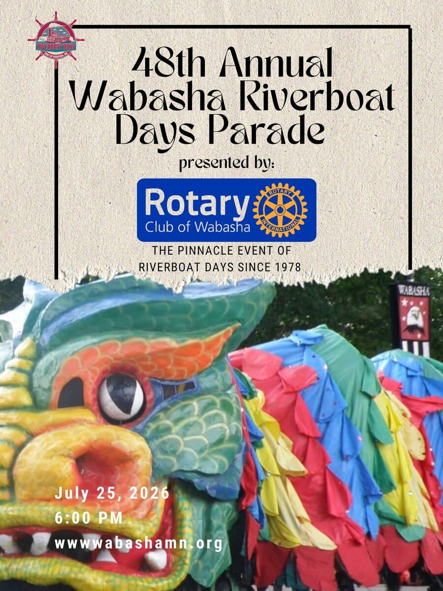 Wabasha Wabasha, MN, United States🚤🎉 48th Annual Wabasha Riverboat Days Grand Parade Presented by Wabasha Rotary Club 🎉🚤 📅 Saturday, July 25, 2026 ⏰ 6:00 PM 📍 Downtown Wabasha! The pinnacle event of Riverboat Days since 1978 is back and bigger than ever! 🎶🎭🎈 Join us for the 48th Annual Wabasha Riverboat Days Grand Parade, presented by Wabasha Rotary Club, where the streets of Wabasha come alive with colorful floats, lively music, local organizations, and plenty of hometown spirit! 🇺🇸✨ 📣 We’re excited to welcome back Pure Country as the official parade announcers, bringing energy, enthusiasm, and that familiar hometown voice to the parade route once again! From music and dance teams to classic cars and community groups, this must-see parade is a highlight of the summer and a celebration of everything that makes Wabasha special. Gather your family and friends, grab a spot along the route, and get ready for an evening of fun, tradition, and small-town charm at its best! Don’t miss it—see you at the parade! 🎉🎺 Registration